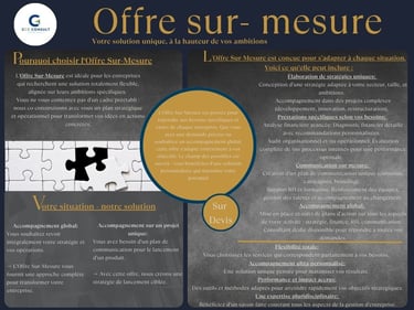 Nous offrons des solutions sur mesure pour répondre à vos enjeux, en garantissant un suivi rigoureux et une approche orientée vers la réussite à long terme de vos projets.